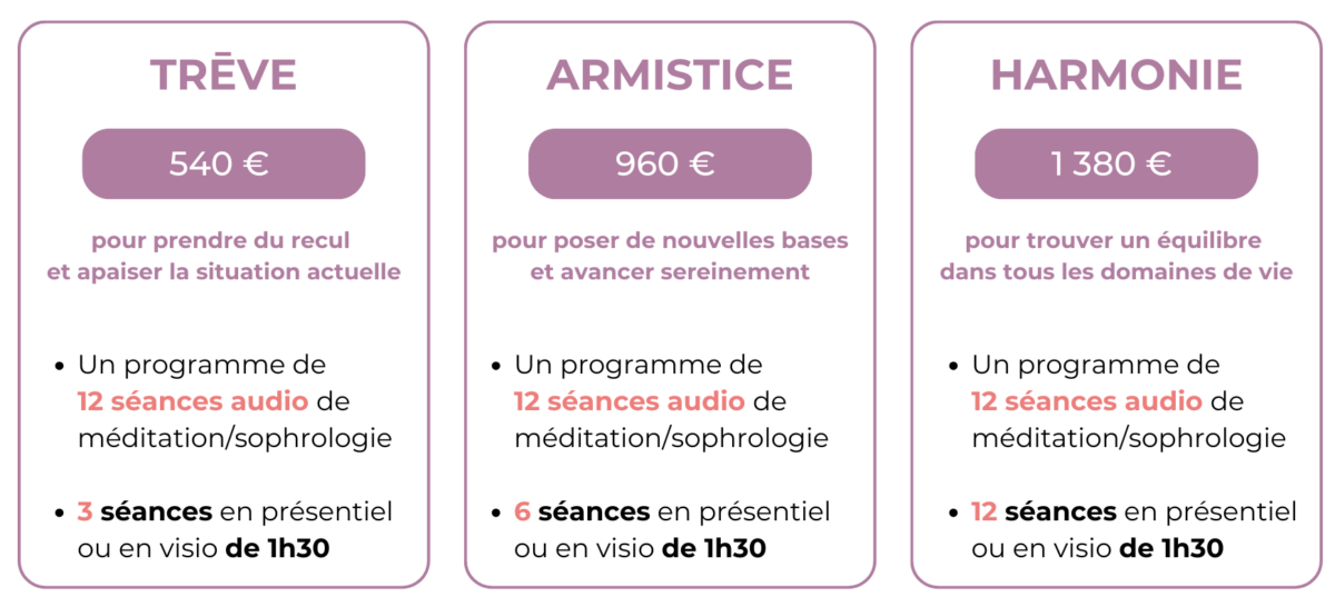 - 12 séances audio de méditation et sophrologie pour une transformation en profondeur, structurées autour de 6 piliers : Trêve, Médiation, Réconciliation, Réforme, Traité de paix, Consolidation.